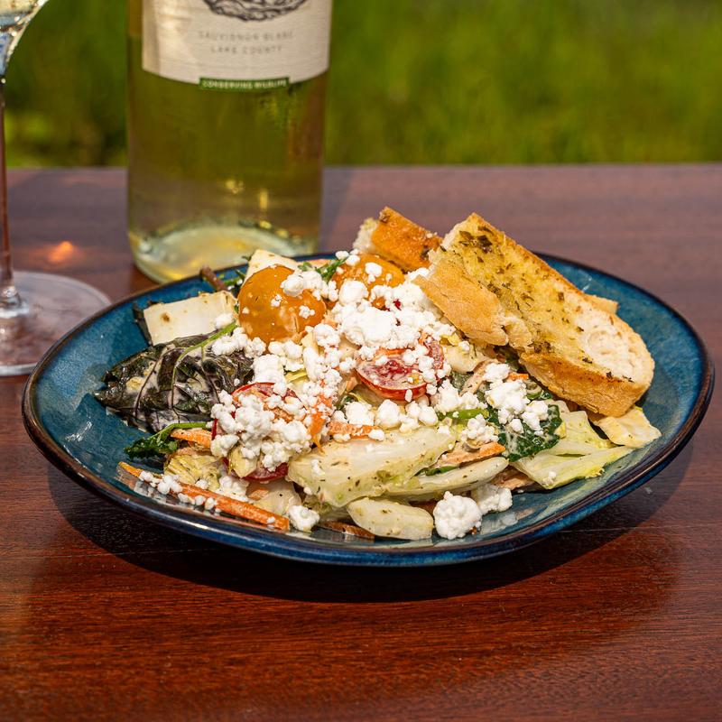 Napa cabbage, baby kale, julienne carrots, tomatoes, chevre, roasted poblano goddess dressing, crostini